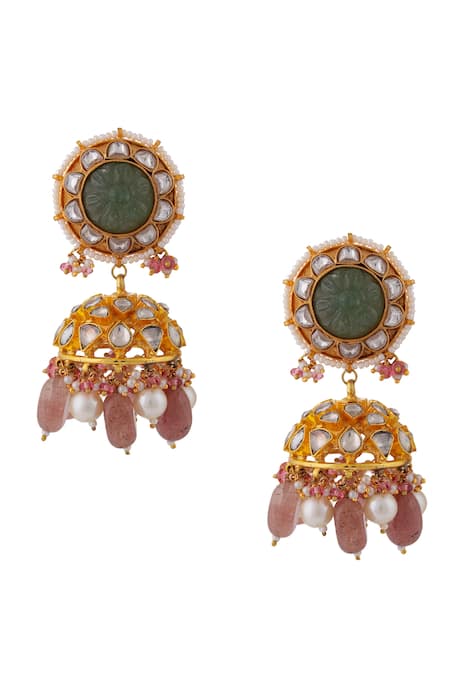 Green jhumka earrings embellished with kundan, pearls, and pink stones