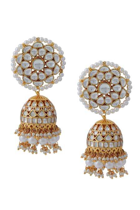 White jhumka earrings featuring kundan stone embellishments and pearl accents