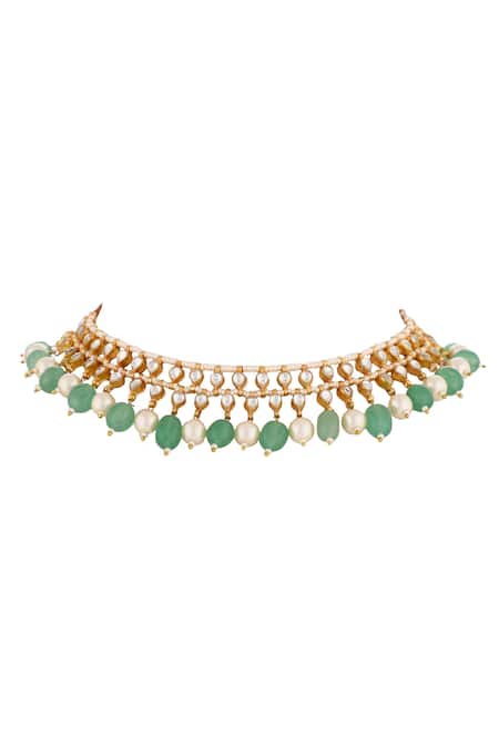22kt matte gold plated necklace featuring layered tear drop cut work details with white stones, pearls embellishment, and sea green bead drop tassels. Paired with floral embellished earrings with similar detailing.