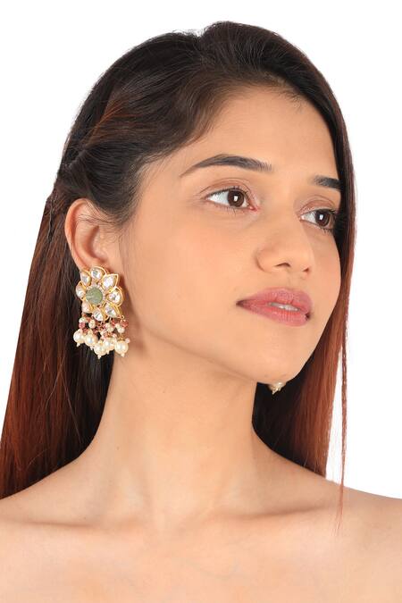 Multiple strands of pearls in the necklace, Push back closure for earrings, Floral pattern with mozanite stones