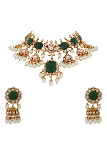 Green Mirrors, Stones Mozanite Embellished Choker Necklace Set