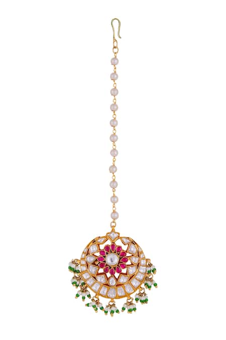 22kt matte gold plated maangtikka featuring kundan and pearl embellishments