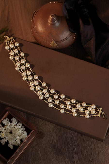 Layered choker featuring white pearl embellishments on a gold plated base. Adjustable dori closure for a customizable fit.