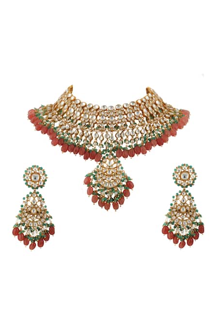 Gold choker necklace featuring encrusted jadtar stones, a crescent moon motif pendant, and cluster stone drops. Paired with matching floral dangler earrings.