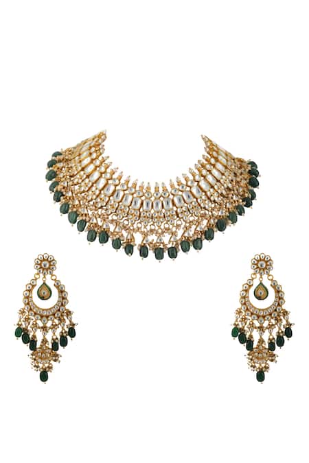 Gold jadtar choker featuring embellished cluster pearls and green stone drops. Paired with floral chandbalis adorned with enamel details and teardrops.