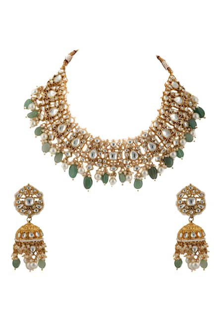 Gold jadtar choker featuring encrusted jadtar stones, embellished pearls, and sea green bead drops. Paired with matching floral jhumkas adorned with cluster beads.