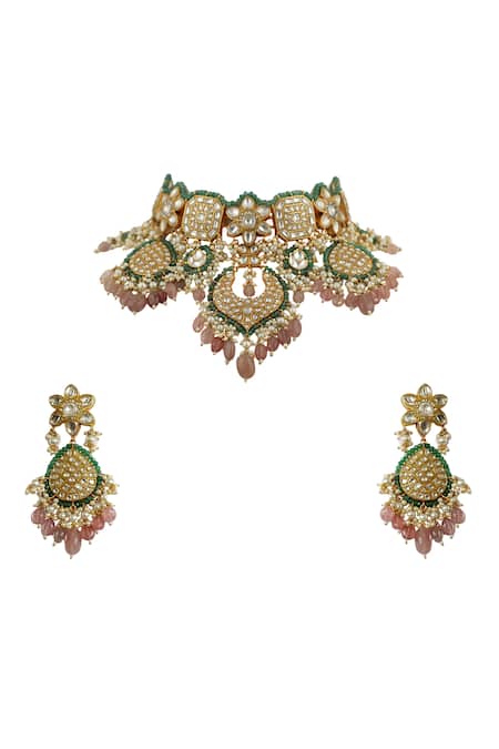 22kt gold plated choker featuring geometric and floral motifs with stone drops. Paired with matching earrings adorned with pastel pink beads and green moti work.
