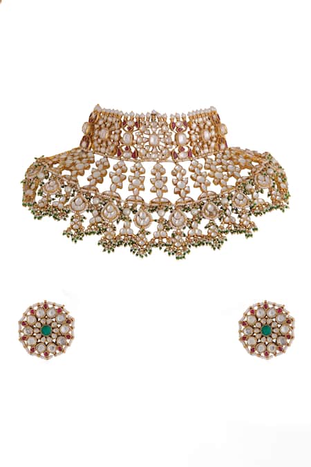 White stone embellished choker featuring bead drops. Paired with matching earrings adorned with intricate patterns and colored stones.