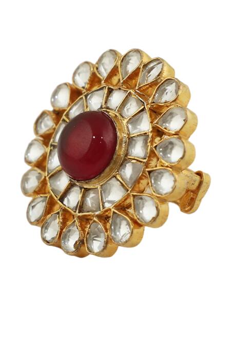 Gold adjustable ring featuring a floral motif with real jadtar stones and semi-precious pearls