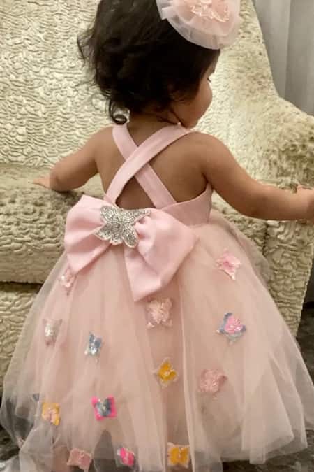 Peach dress featuring butterfly motifs and Swarovski bow embellishment