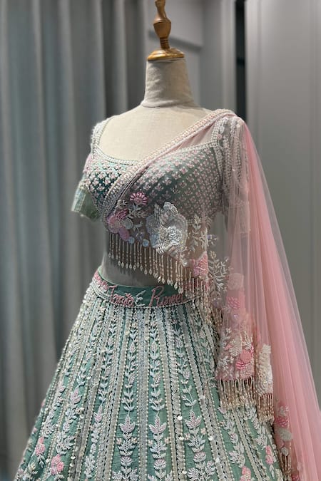 Sage green lehenga featuring hand embroidery with pearls, glass beads, sequins, and beads. Paired with a padded embroidered blouse and two dupattas, one in a drape style and the other as a veil.