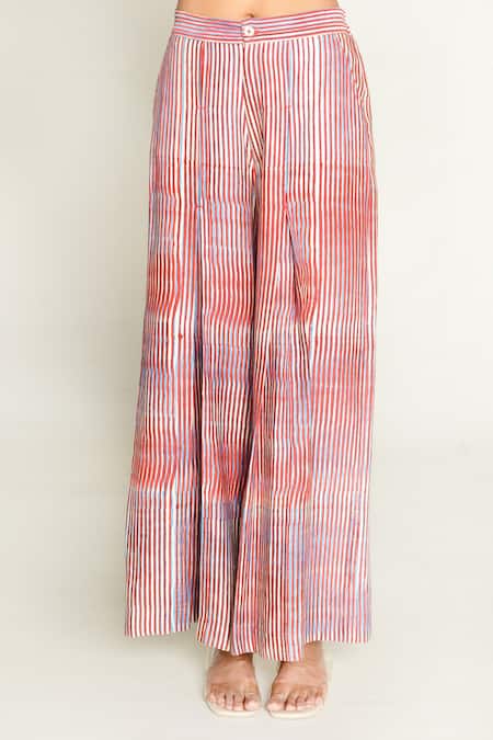 Multi color wide legged pant featuring all over stripe and plosky cloud prints