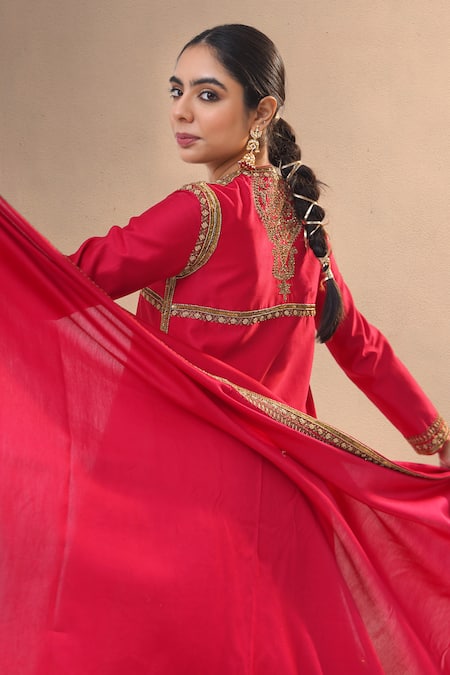 Red Chanderi Silk, Chanderi, Cotton Satin Zardozi Jacket Anarkali Set
