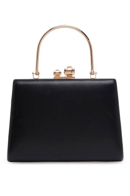 Black square-shaped clutch featuring stone embellishments on the front and a metal alloy frame