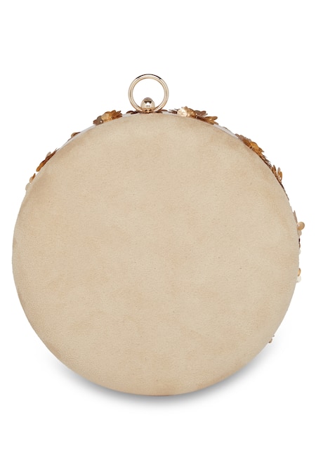 Gold suede circular-shaped clutch adorned with sequin embellishments and a gold frame