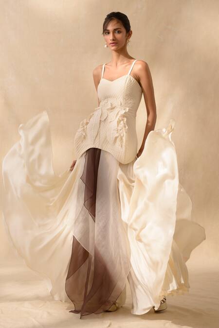 Beige corset peplum top featuring a sweetheart neckline with checkered pattern quilting and 3D flower applique work. Paired with beige and brown ombre flared pants with asymmetric multi panels.