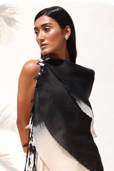 Ivory & black gown featuring layered draped panels and one side draped sleeve