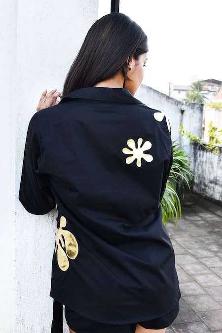 Black Cotton Hand Work Leather Collared Leaf Detailed Shirt