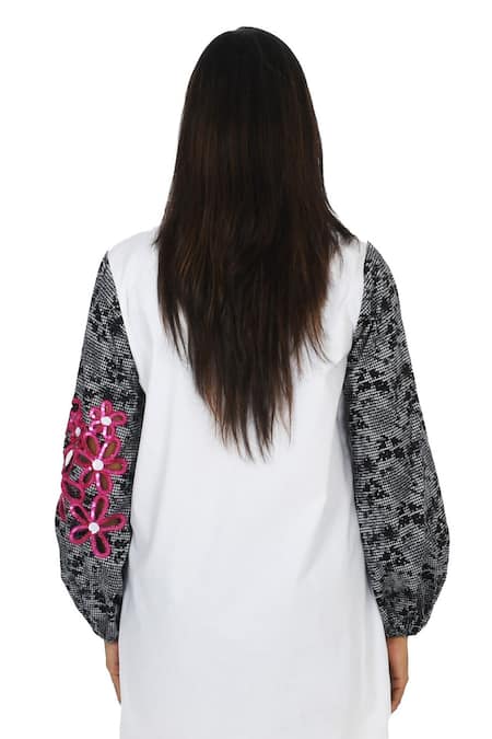 White dress featuring black and white chequered print sleeves with pink sequin floral embroidery cut out