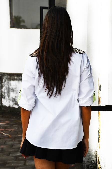 White Cotton Hand Embroidery Spike Patch Collared Detailed Shirt