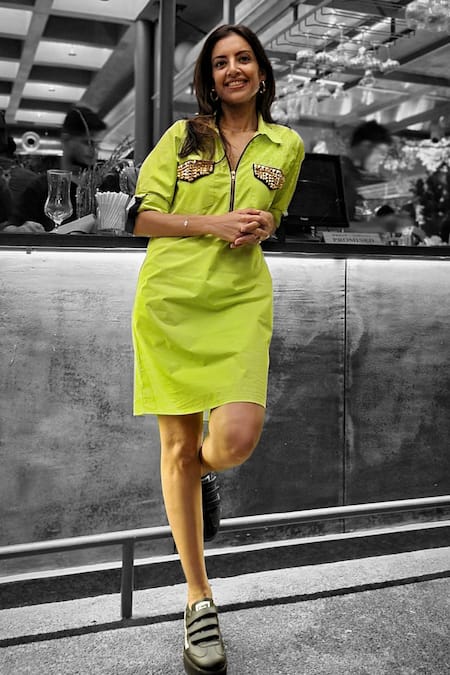 Neon green dress featuring a collared neckline and three-quarter sleeves with studded front pockets