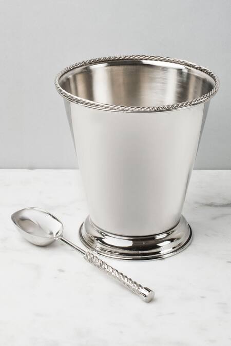 Silver ice bucket with twist detail on the rim and a circular-base. Comes with an ice scooper with a twisted handle.