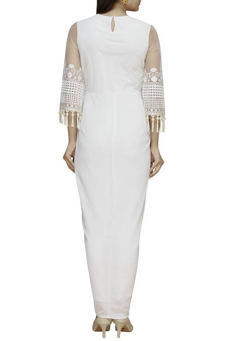 Off White Bubble Crepe Round Embroidered Draped Gown