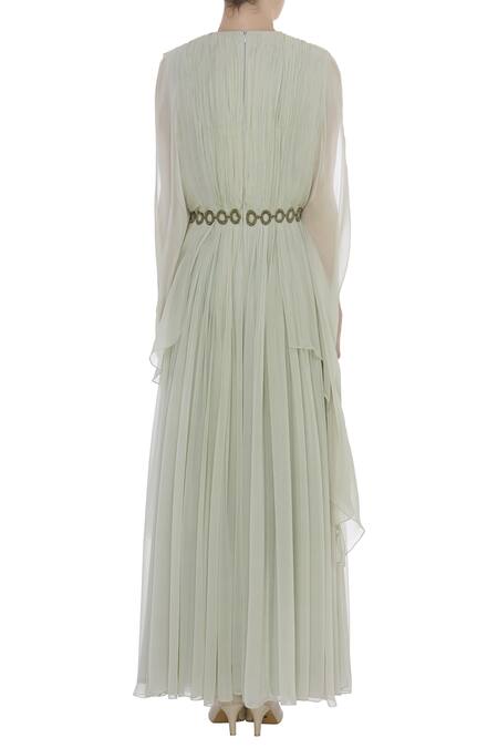 Green kimono-style gown accentuated with sequin and bead patchwork embroidery on the yoke and waistline.