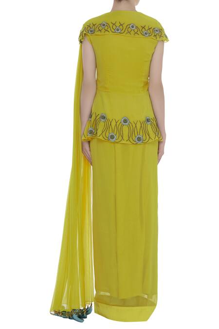 Yellow Peplum Attached Draped Blouse With Pleated Lehenga