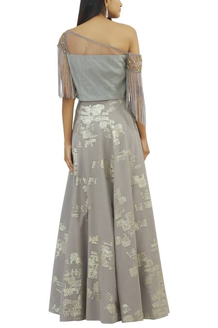 Grey one shoulder blouse with all over embellishment & sleeve fringe detail. Comes with abstract motif foil print lehenga.