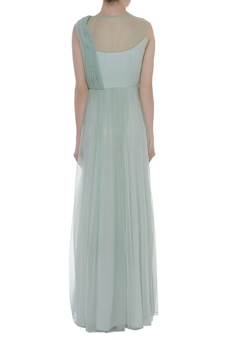 A dress that exudes effortless grandeur style and is also high on comfort is this sequin embroidered, sage green-hued gown. Team it with caged heels and a long dangly earrings for a romantic date night look.
