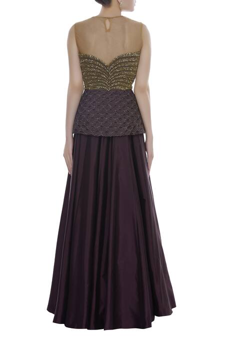 Purple Tafetta Round Sequins Embellished Peplum Blouse And Lehenga Set