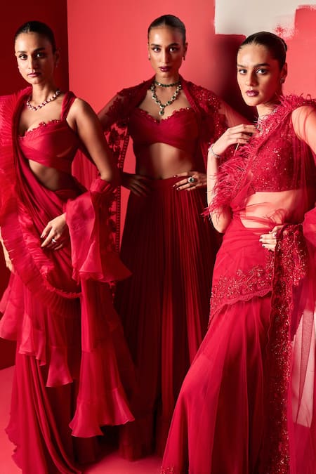 Red pre-draped saree featuring pleated ruffle border and an embroidered neckline blouse. The blouse is made of net fabric while the saree is crafted from chiffon.