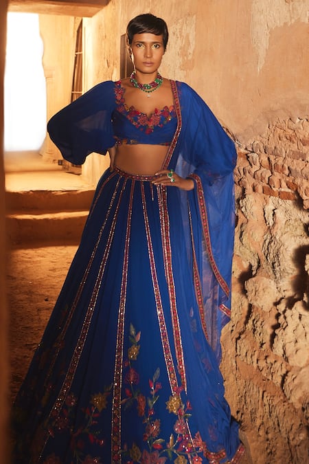 Blue Blouse Georgette Embroidery Floral Adaj Floweret Lehenga Set