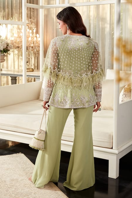 Green Tunic And Belt Net & Pant Georgette Azalea Cape Style & Set