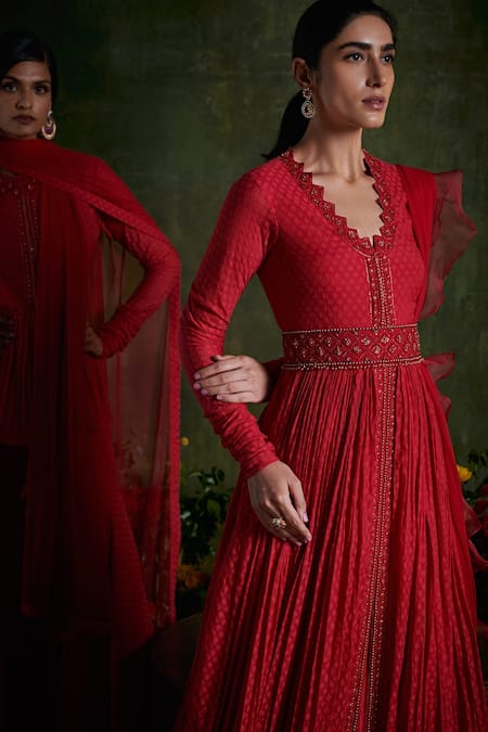 Hibiscus red anarkali highlighted with intricate floral embroidery, jacquard woven motifs, Comes with ruffle dupatta & embroidered belt.