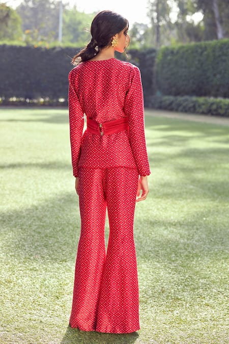 Shop_Ridhi Mehra_Red Chanderi V Neck Printed Pant Set _Online_at_Aza_Fashions