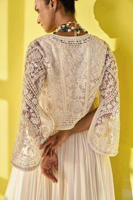 Ivory fine silk anarkali featuring a round neckline and floral embroidery on the neck and waist. Paired with a net jacket adorned with heavy floral patterns and slit bell sleeves.