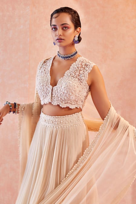 Ivory two-tiered lehenga with gathered flare & frill detail. Comes with floral motif worked net blouse & dupatta.