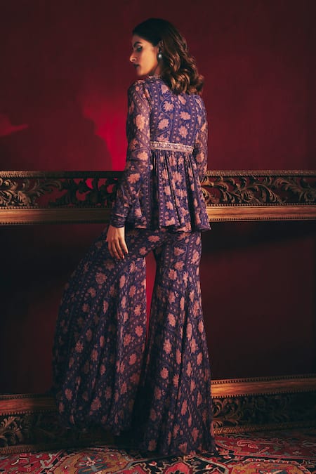 Navy blue peplum tunic with floral print and embroidery on the neckline. Comes with sharara and net dupatta.