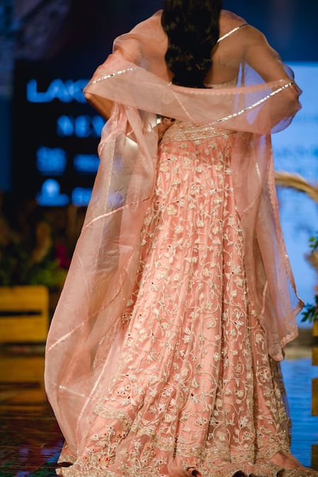 Peach lehenga with all-over floral motif work. Comes with embellished blouse & dupatta.