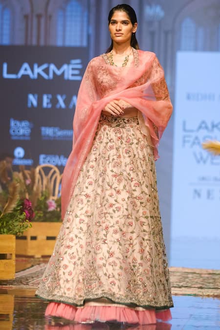 Beige & pink toned lehenga with all over floral bel motifs. Comes with blouse & organza dupatta.