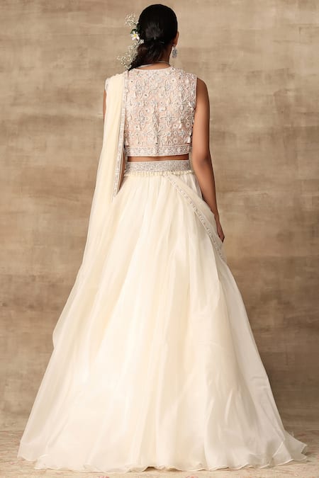 Ivory flared organza lehenga paired with peach tinted pink blouse enhanced with all-over floral motif work. This set comes with pearl tassel belt & embroidered dupatta.