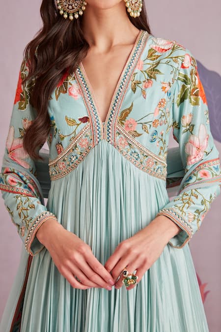 Sea green anarkali with floral printed motifs and embroidery. Comes with net dupatta.