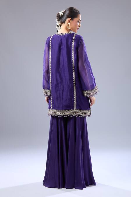 Purple kurta featuring floral embroidery with scallop hem. Paired with a sharara and a dupatta.
