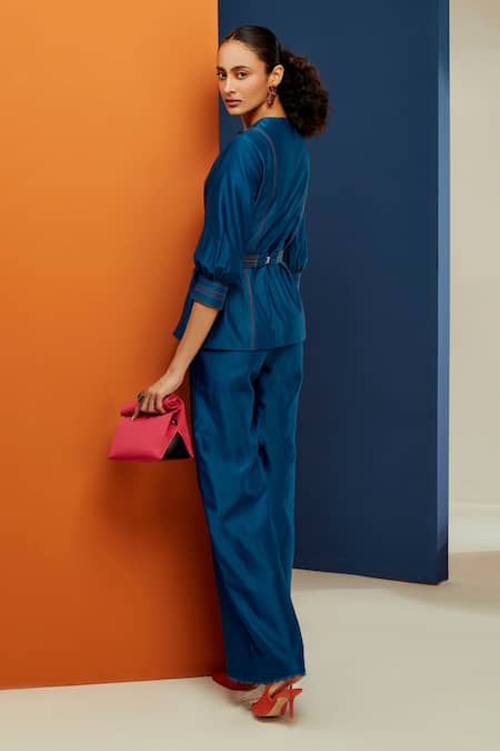 Blue Chanderi Round Jemma Shirt And Flared Pant Set
