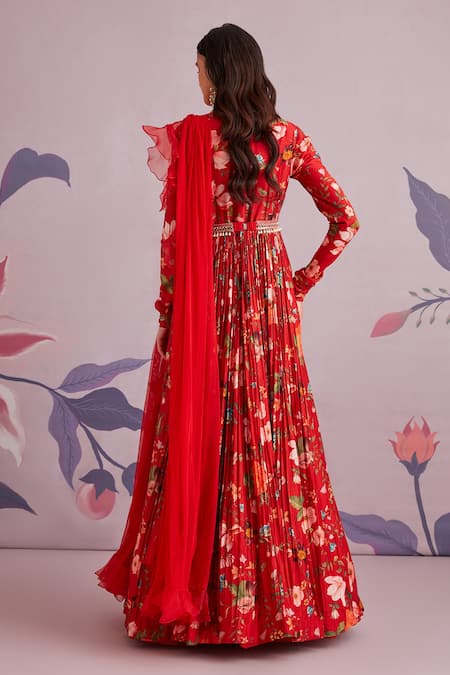 Red anarkali with floral printed motifs and embroidery on the placket. Comes with ruffle dupatta and belt.
