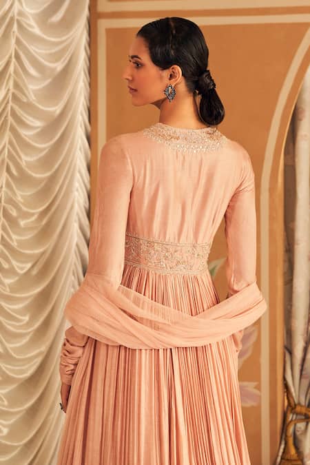 Dusty pink silk anarkali featuring gathered flare and bloom embroidery with cutdana-sequin highlights. Paired with an embroidered net dupatta.