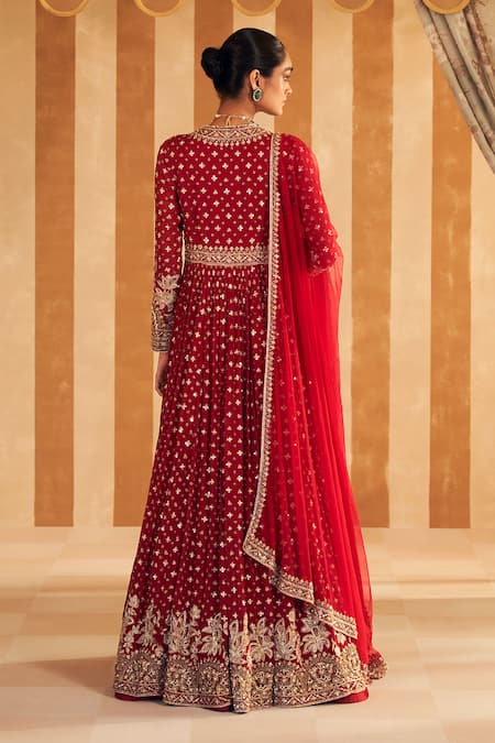 Red anarkali featuring zardozi embroidered floral motifs embellished with sequins, beads, and pearls. Comes with a sheer dupatta for an elegant finish.