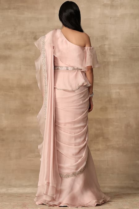 Blush pink pre-draped saree with ruffle border. Comes with one-shoulder peplum blouse & sequin worked belt.